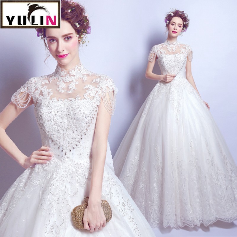 Women S Luxurious Crystal High Neck Short Sleeved Wedding Gowns Short Sleeved Wedding Dresses