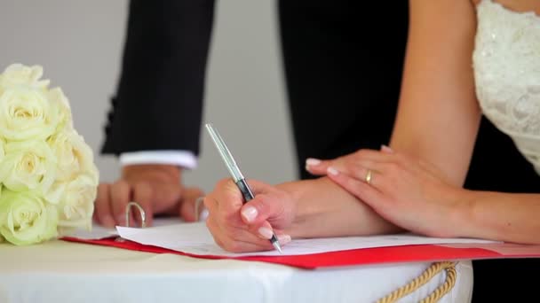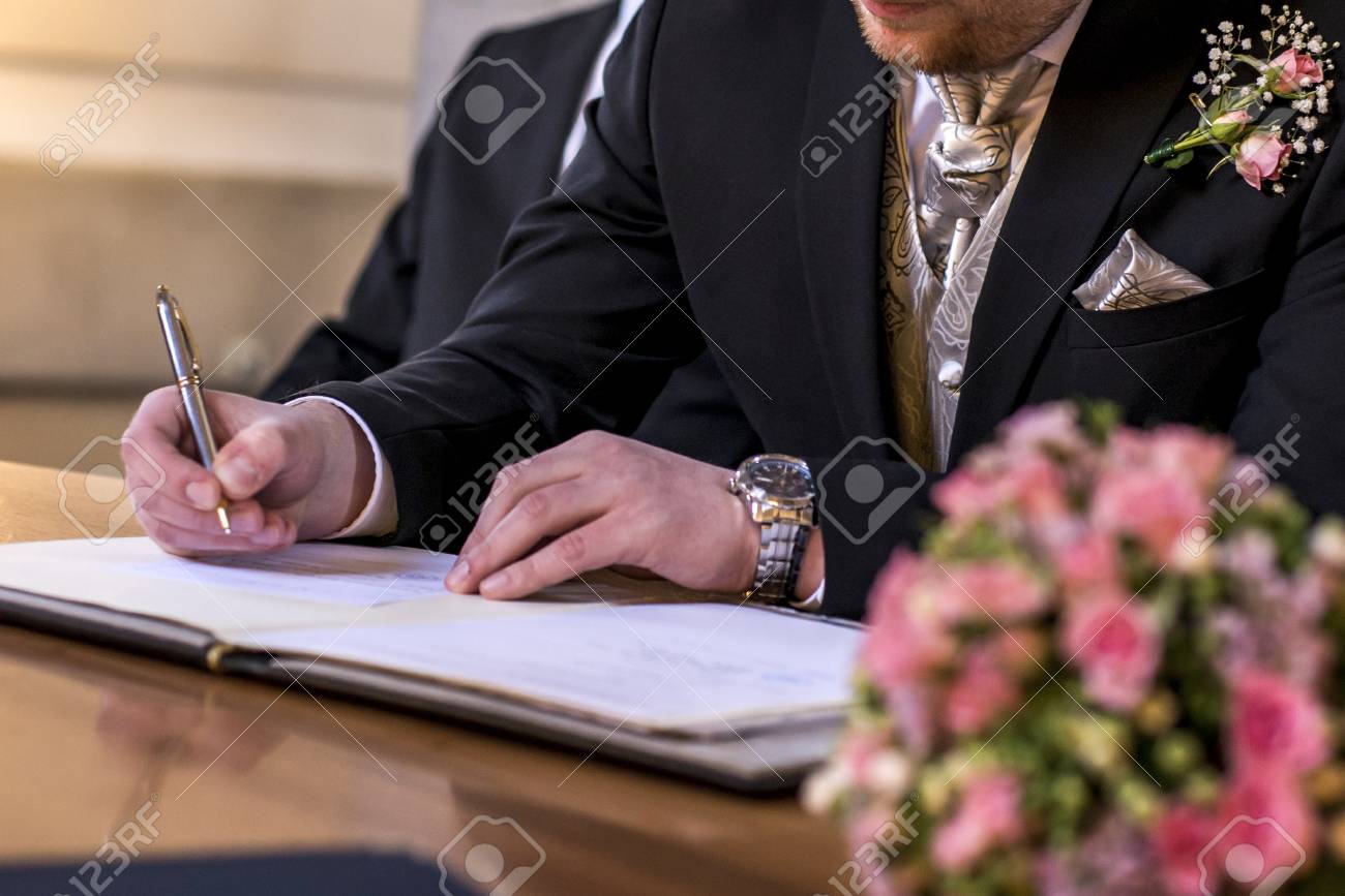 Bride Signing Wedding Register Documents Focus On Hand Stock Signing The Wedding Register