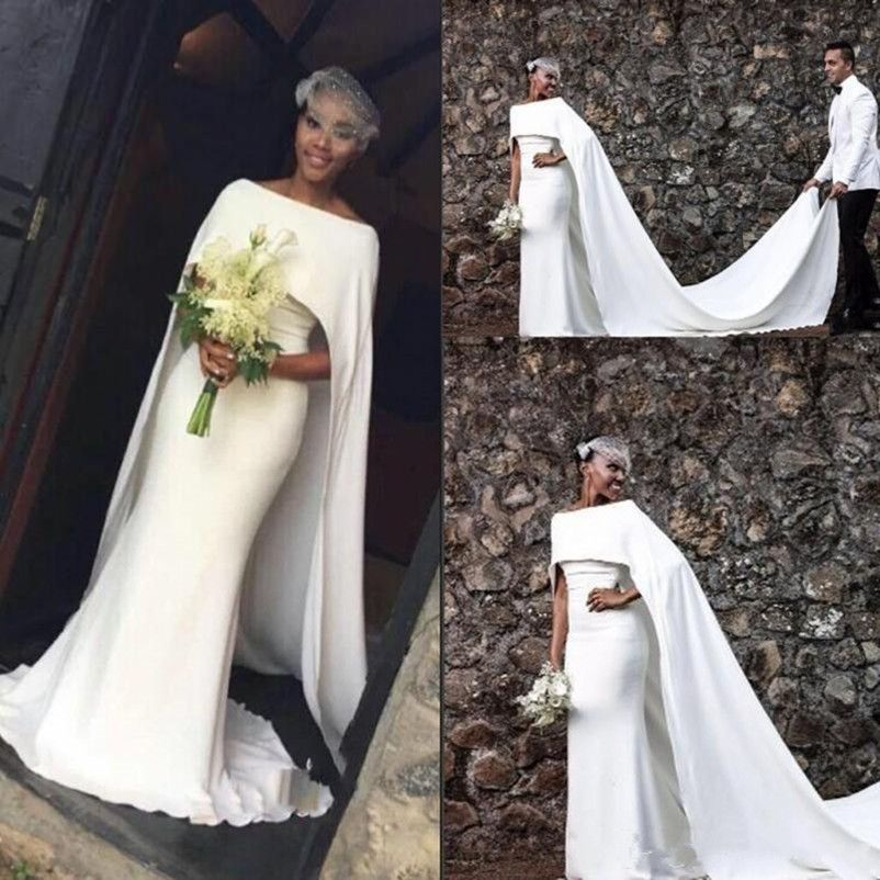 Simple Style White Beaded Mermaid Wedding Dress Beach Bridal Gown Simple Wedding Dress With Cape